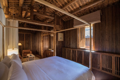 村上酒舍位于浙江衢州市常山县新昌乡有着550多年历史的古村泰安村,由一栋200多年的清代徽派老房子改造而成,以古法酿酒为民宿主题。改造最大程度的保存了原建筑结构、特征和原始风貌,并增加房屋牢固性、保温性、防水性等更符合现代城市居住要求。二楼原是堆放杂物和粮食的空间,全部改造成了客房。整个建筑能完整保留成为当地特色古民居风貌的样板展示。村上酒舍以一个民宿求活一个古村,拯救了整村免被整体拆迁的命运,保留了全村人的文脉和共同的乡土记忆,是中国众多乡村遗产保护性开发的示范样板。